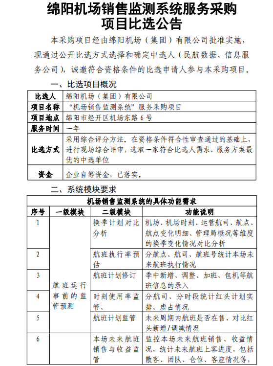 綿陽機(jī)場銷售監(jiān)測系統(tǒng)服務(wù)采購項目比選公告